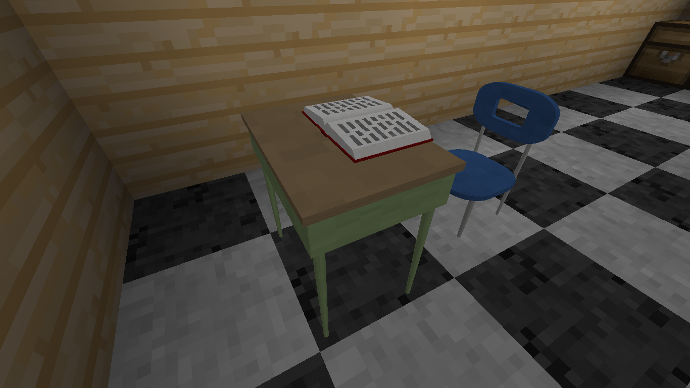 Desks and chairs. Posters and chalkboard. Clock and firebell.