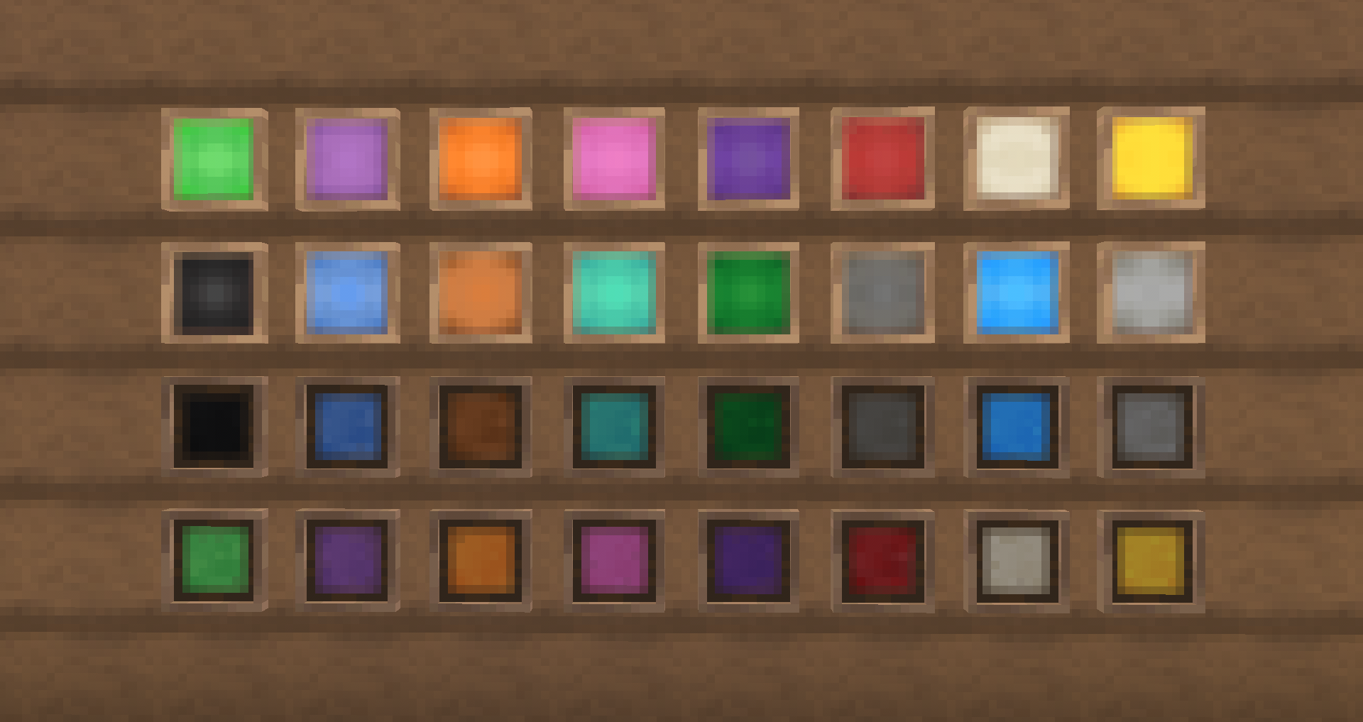 This mod extends the default item frame system by introducing fully colored variants and their glowing counterparts. Each frame color has a dedicated texture, ensuring consistency with the visual style. The glowing versions emit light and make displayed items easier to see.