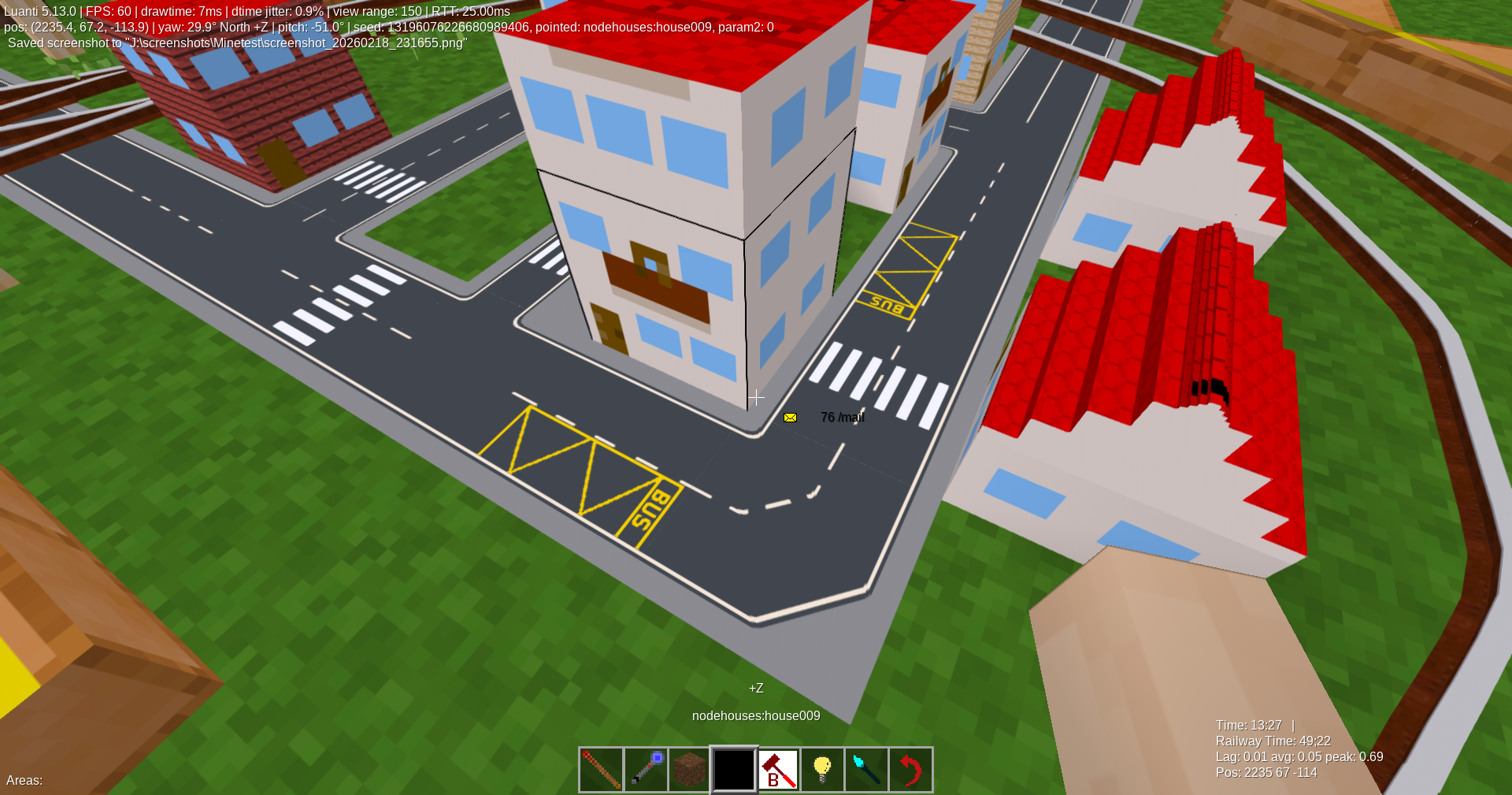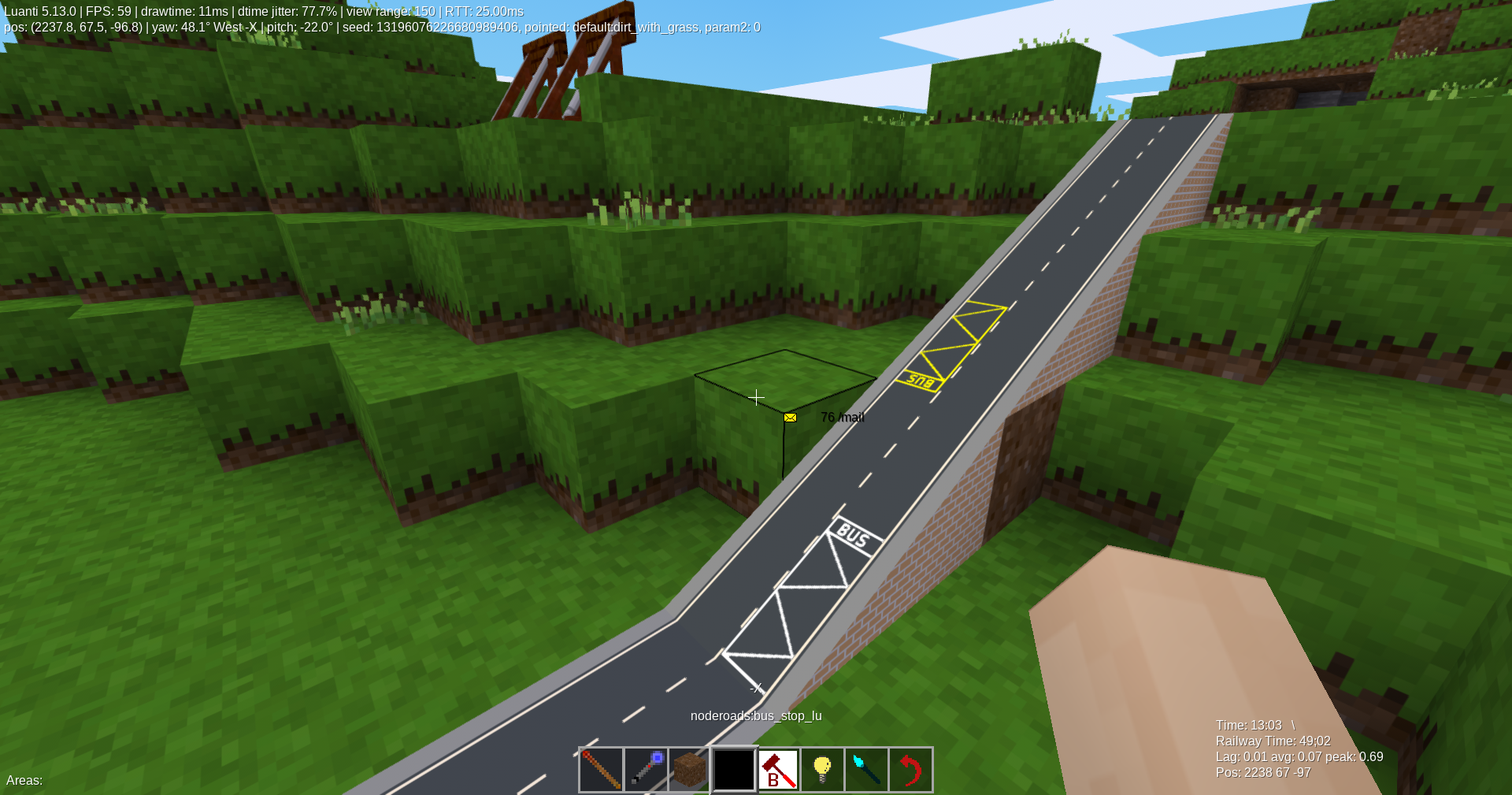 Node roads is a mod by MatyasP that adds one-node roads. Now, mod has 8 slope nodes, 255 (85 per top texture, types node, slab, flat) road & crossroads nodes, 1 sidewalk node (too 1 flat and 1 slab), 6 bridge nodes & 6 bridge slabs, 2 bridge pillar nodes.