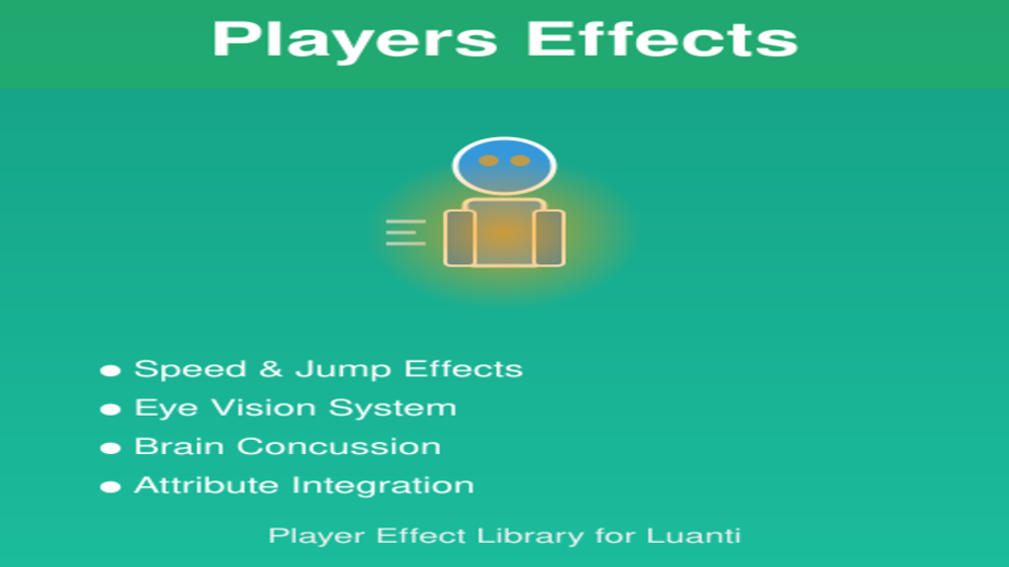 Provides various predefined effects over players to be used by other mods. Includes basic attribute effects (speed, jump), eye vision effects (left/right eye vision quality with HUD overlays), and complex brain concussion system with visual shaking, sensitivity effects, and item drop mechanics. Supports integration with player_monoids and pova mods. See README.md in repository for more informations.