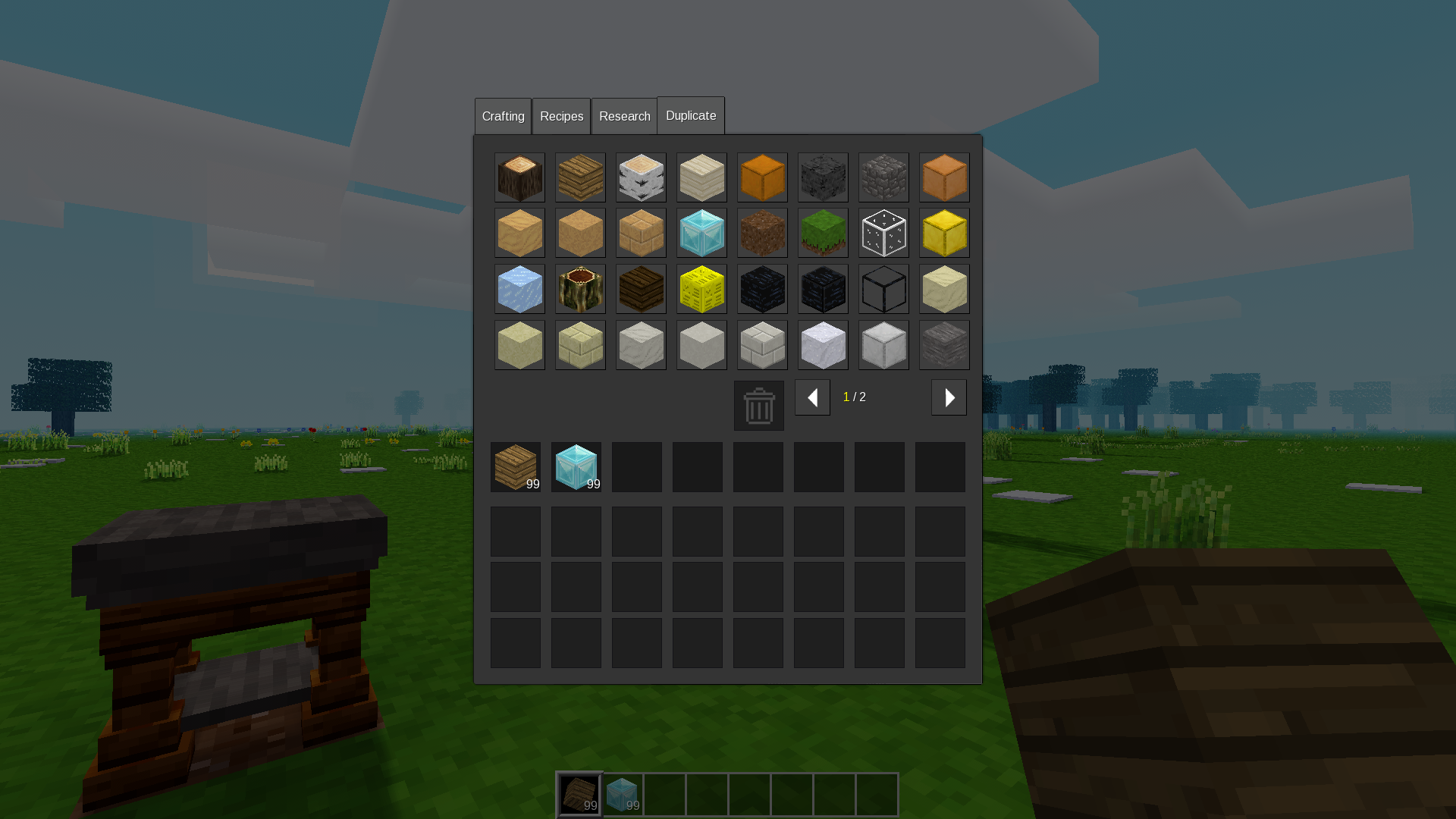 This mod lets you duplicate items that have already been fully researched. Instead of using the research slot, it shows an inventory tab with all unlocked items and gives you a full stack on click.