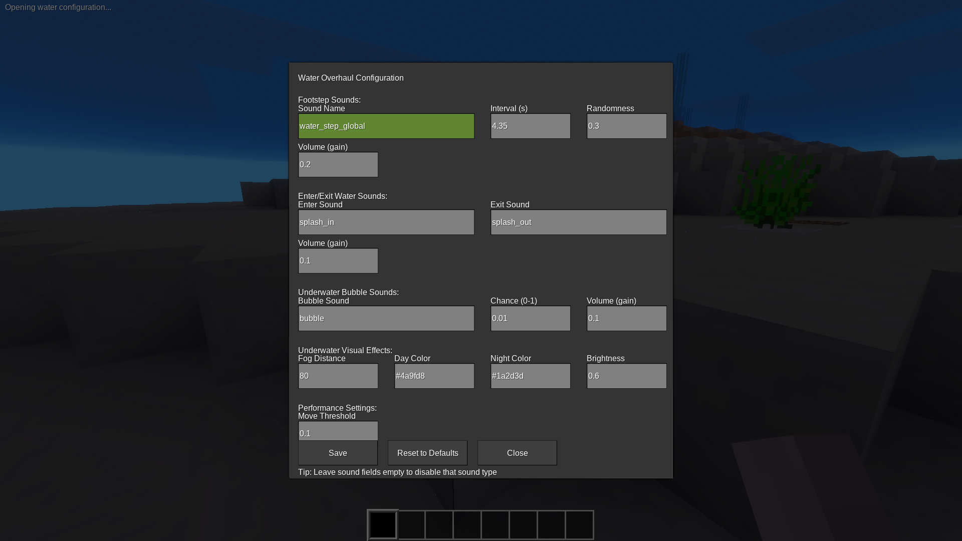 - adds configurable underwater fog coloring that dynamically interpolates between daytime and nighttime colors based on time of day