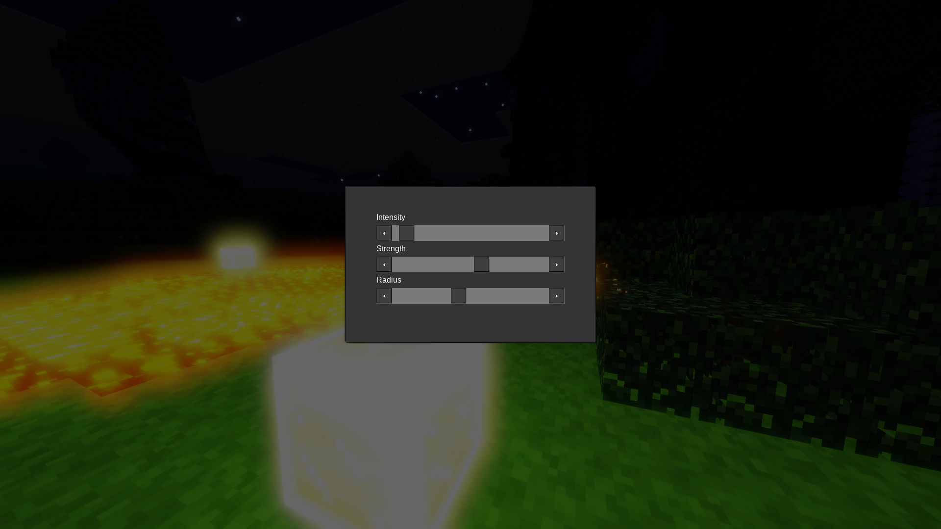 Enable and Change Bloom independent of the Game. The changes are applied instantly so you can easily adjust the settings to your liking. Bloom settings are saved per player per world.