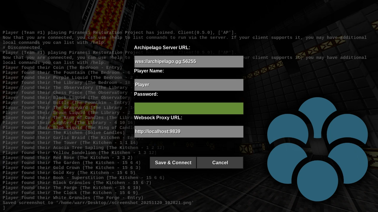 modstore: Luanti mod storage for persistencestoreprefix: Optional prefix for storage keysurl_target: Archipelago WebSocket URLurl_proxy: HTTP proxy URL (default:http://localhost:9839)login_slotname: Player slot namelogin_gamename: Game namelogin_password: Optional room password