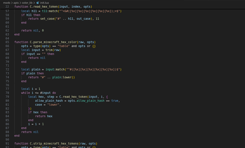 color_lib.read_hex_token(input, index, opts)color_lib.parse_minecraft_hex_color(raw, opts)color_lib.strip_minecraft_hex_tokens(raw, opts)color_lib.render_minecraft_hex_text(raw, opts)