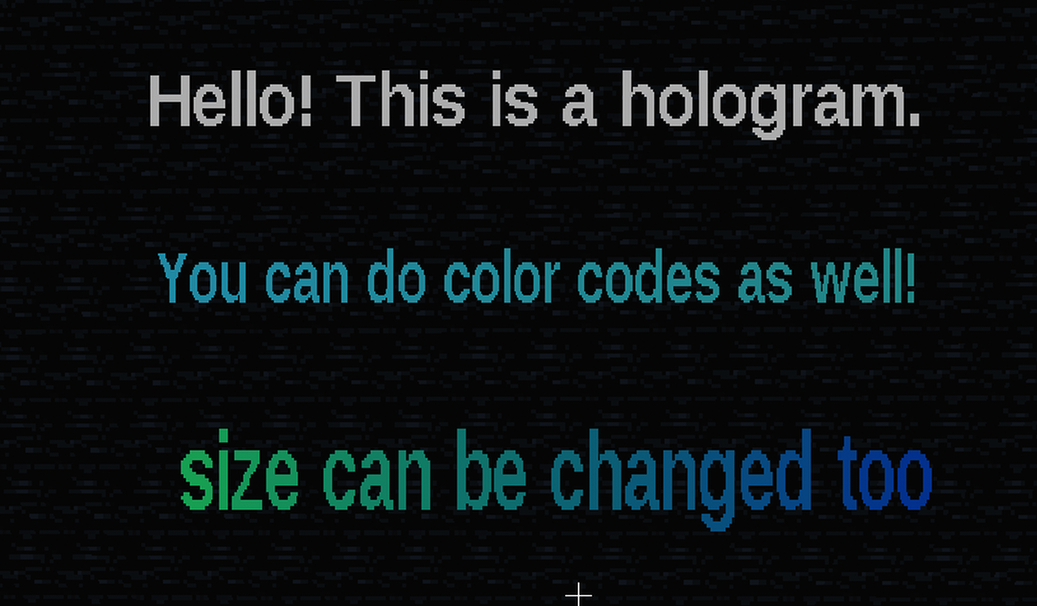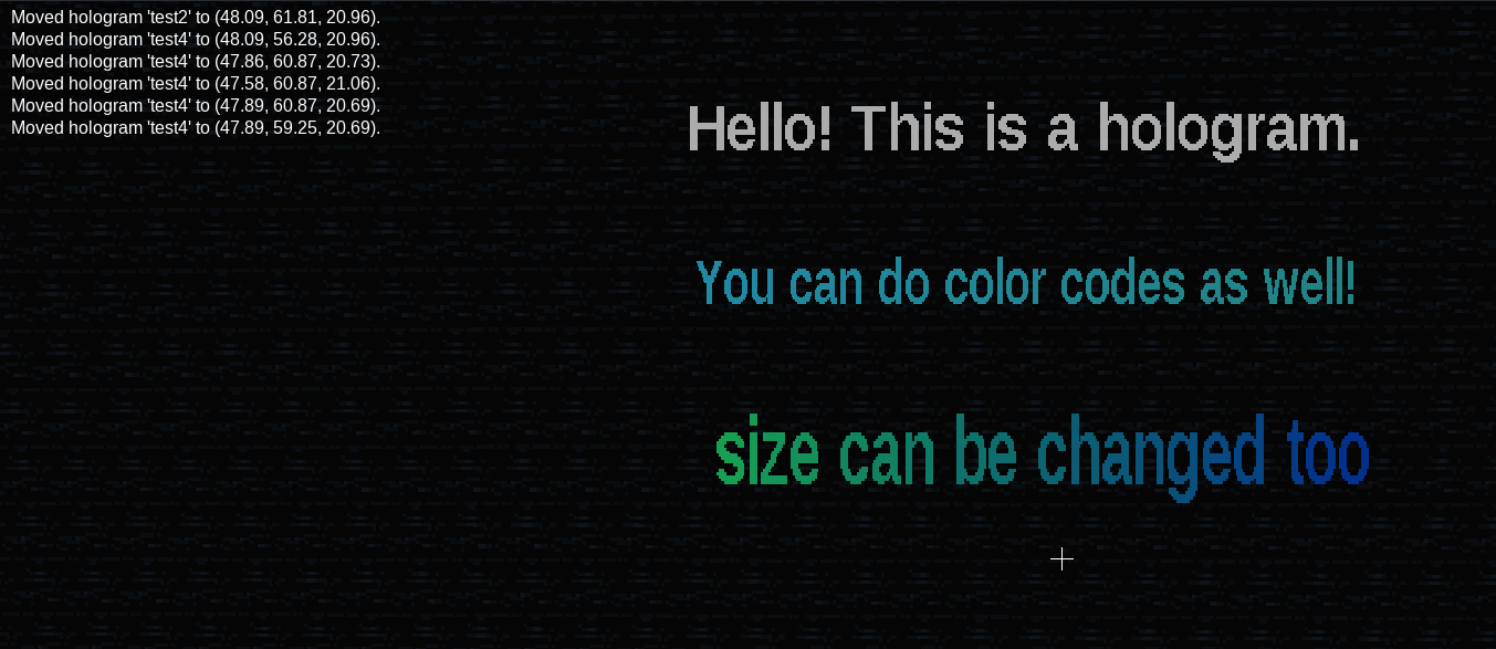 /hologram add <name> <x,y,z|~,~,~|~,~2,~4> <text>/hologram move <name> [x,y,z|~,~,~|~,~2,~4]/hologram edit <name> <text>/hologram list/hologram delete <name>/hologram size <name> <scale>