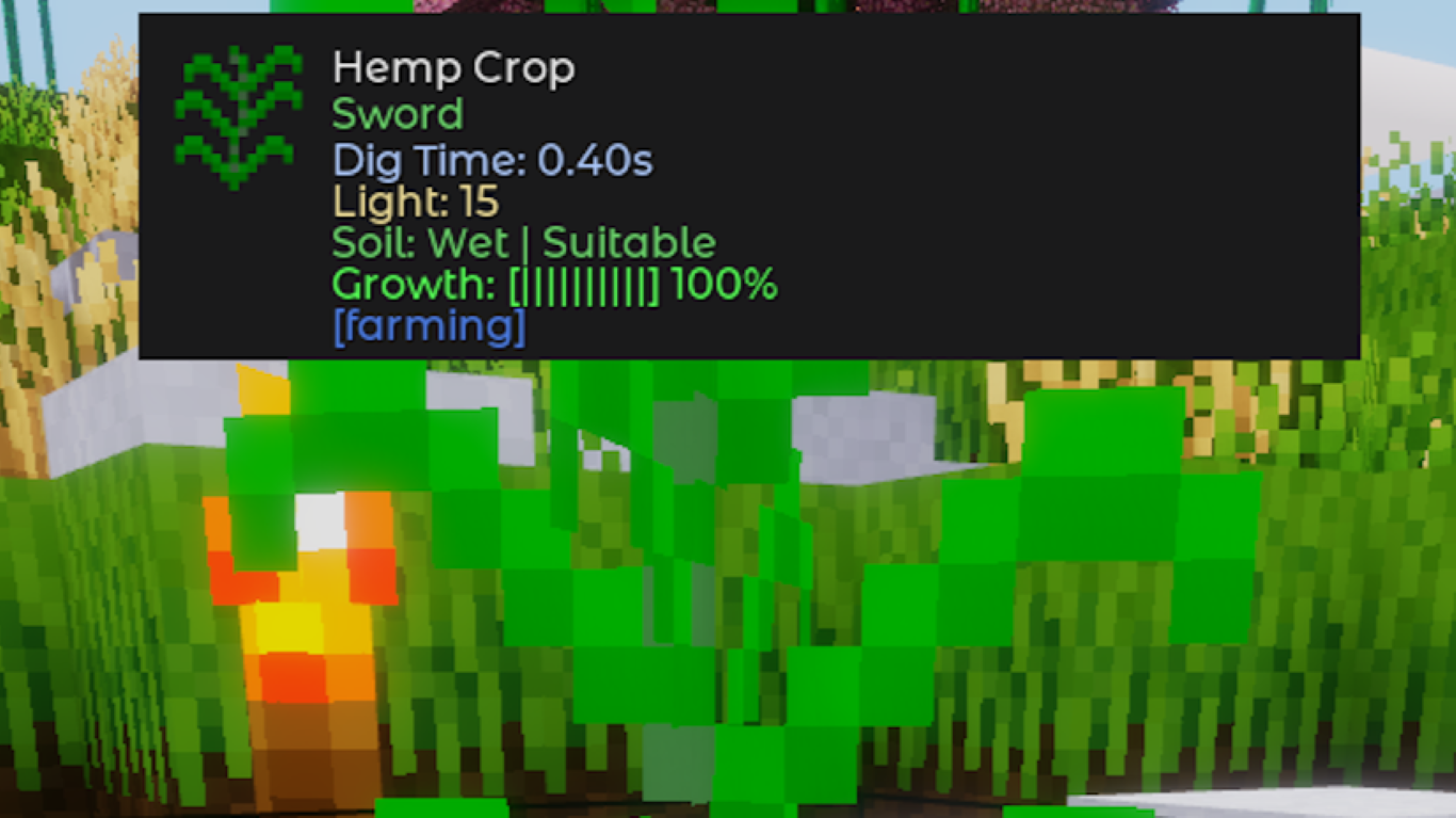 Soil shows as Dry even though water is present Eye Spy scans for water within 3 blocks of the soil position. If the water source is further away, the farming mod's hydration ABM may not have updated the soil block yet — the HUD will reflect the correct state once it does. Moving the water to be directly adjacent resolves this immediately.