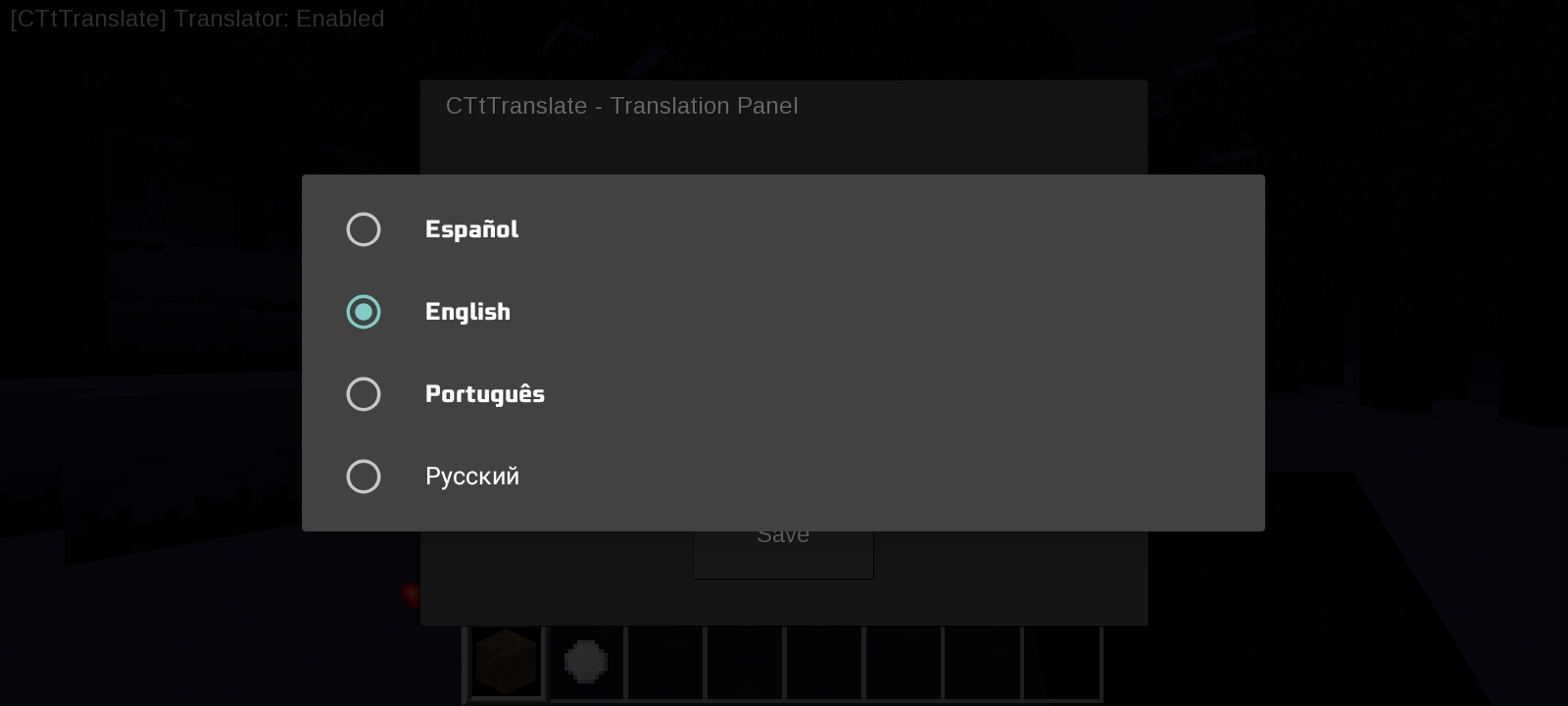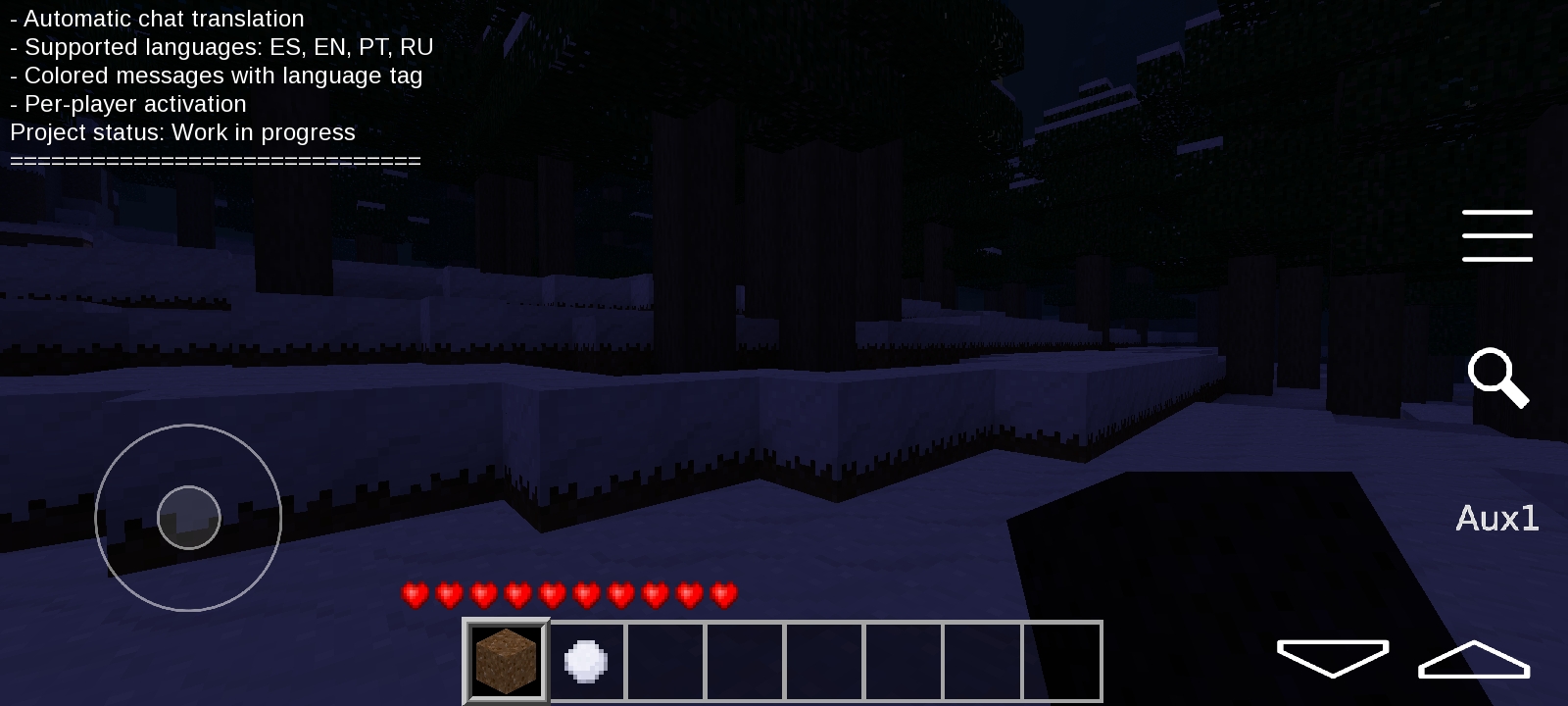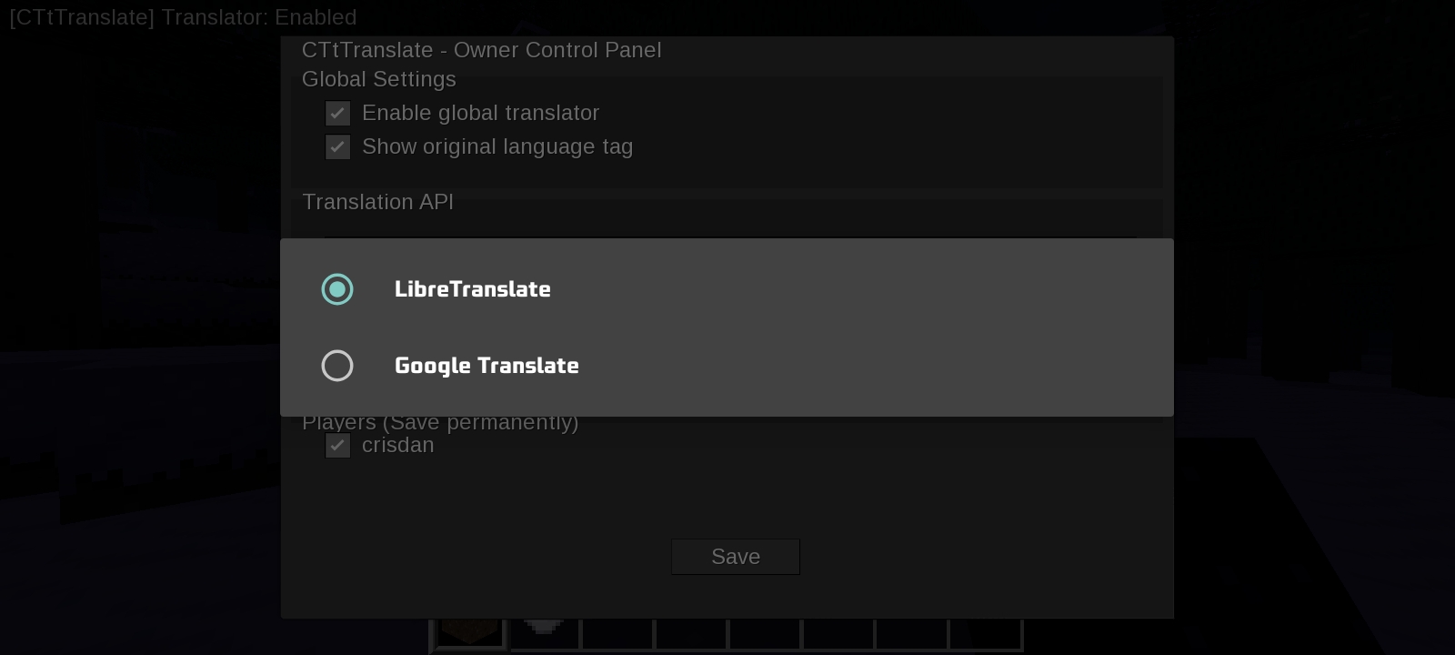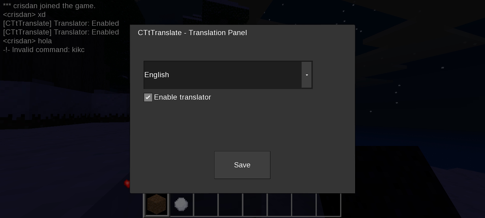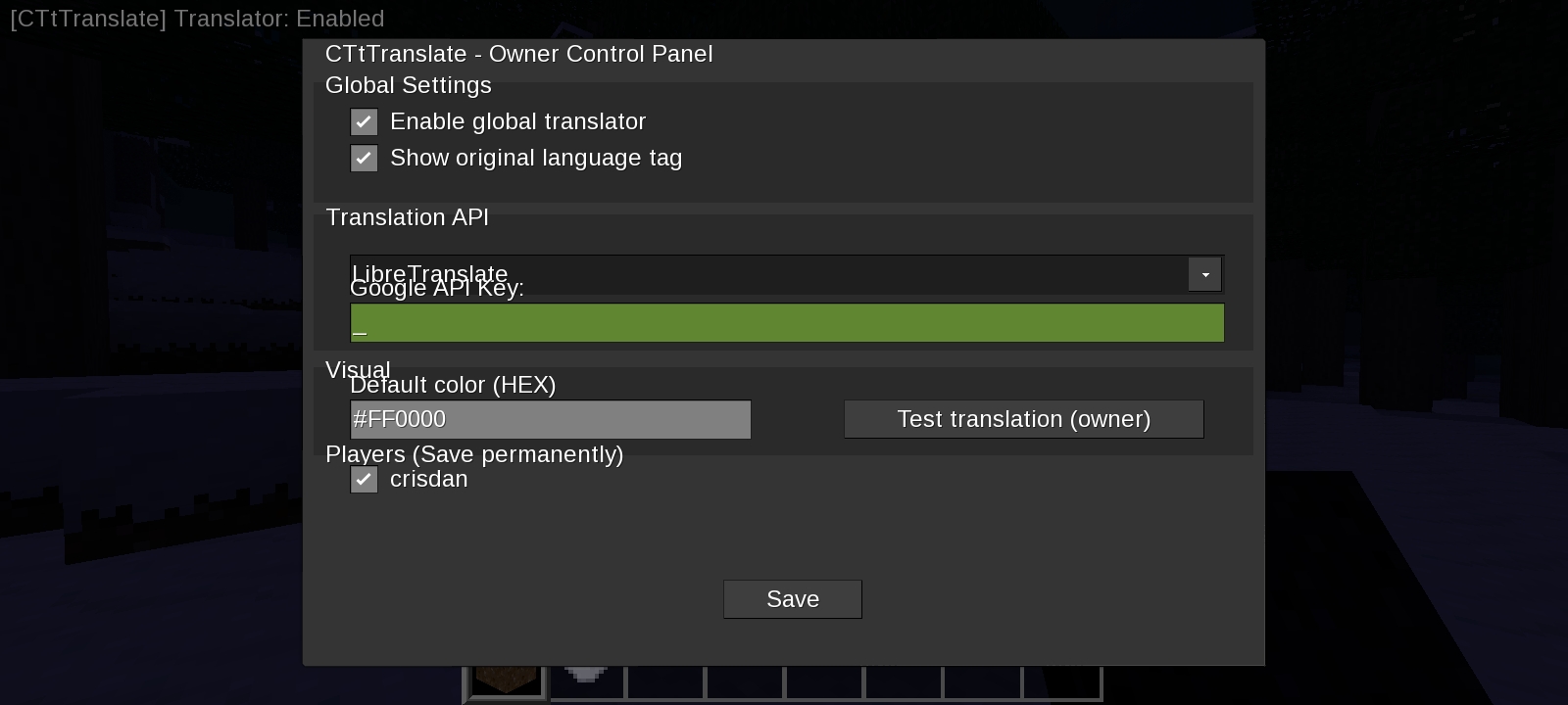 CTtTranslate is a development mod for Minetest that enables automatic chat translation between players. It allows each player to see messages in their preferred language, supporting Spanish, English, Portuguese, and Russian. Players can choose their language and activate or deactivate the translator, while the owner can configure the translation API (LibreTranslate or Google Translate), message colors, global activation, and decide if players’ settings are saved permanently. The mod displays original language tags and colors messages according to configuration, providing a clear visual experience of translated chat. ⚠️ Warnings: This project is under development and may have chat translation issues or cause temporary lag; it does not break worlds or files, but caution is advised. Continuous improvements and new features are planned, based on user feedback and suggestions from the creator, crisdan.
