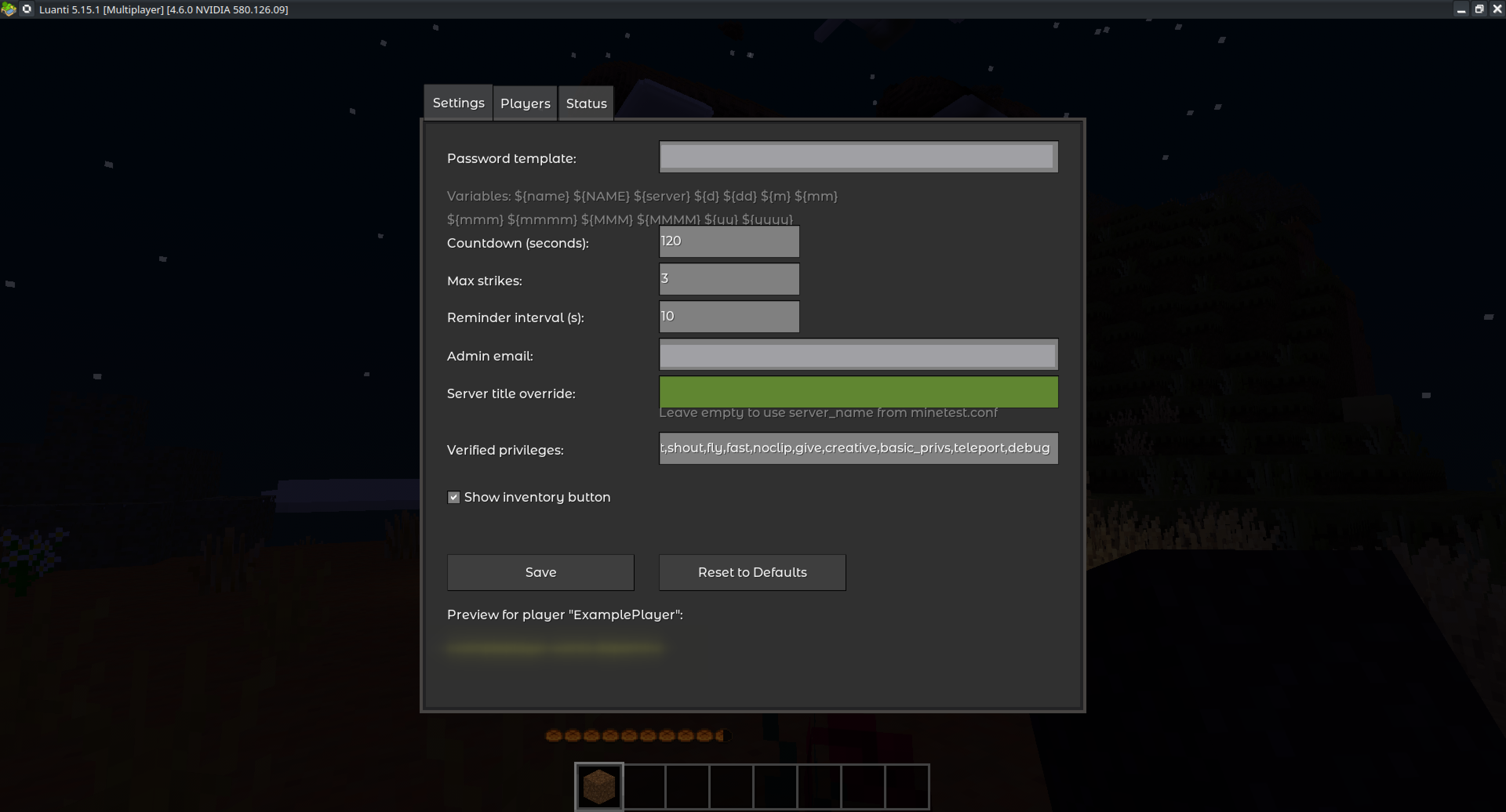 auth_handler.set_passwordviacore.register_on_mods_loaded, since Luanti has noregister_on_password_changecallback. - mod_storage is used for all persistent data (settings, player status, strikes). Do not edit