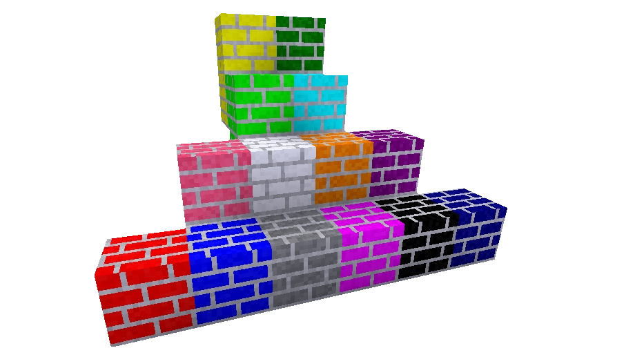 Colored brick nodes for Luanti Minetest. Useful for constructing colored houses and other buildings.