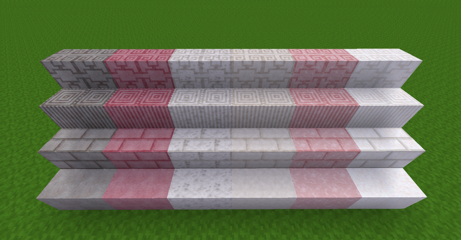 DESCRIPTION: »Quartzy« (quartzy) adds some quartz blocks to Minetest/Luanti. It uses four different patterns called »plain«, »pillar«, »chiseled« and »brick«. Each pattern comes in six different color variations, ranging from »white«, »light_gray«, »gray«, »dark_gray«, »pink« to »dark pink«. This gives you 24 new quartz blocks to build with.
