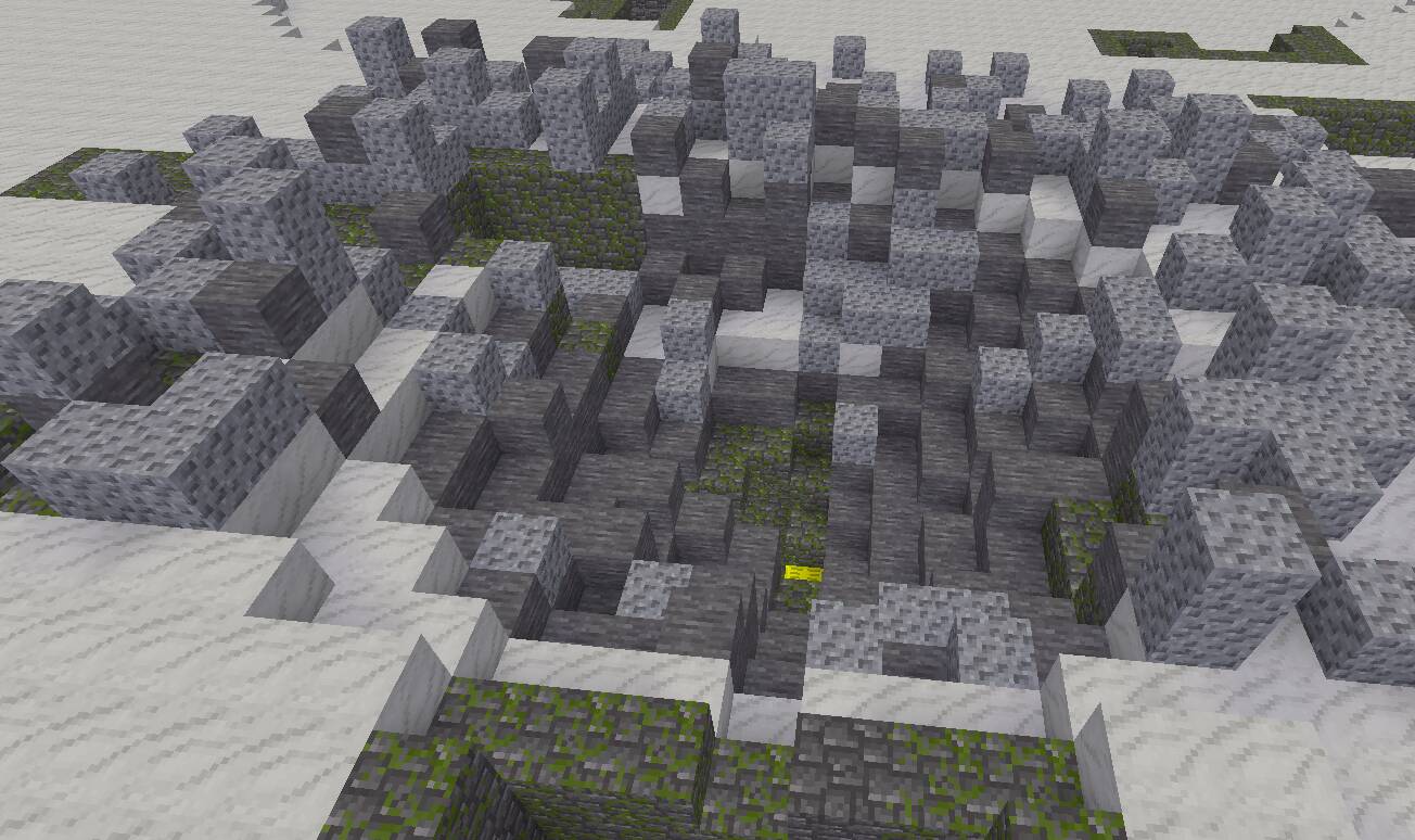 - The primary excavated nodes (stone, desert stone, dirt, grass, desert sand, sand, trees) are counted, the proportions calculated, then randomly layered around the crater in the same proportions and with the same total number of nodes, thickest at the crater rim and thinning inwards and outwards.