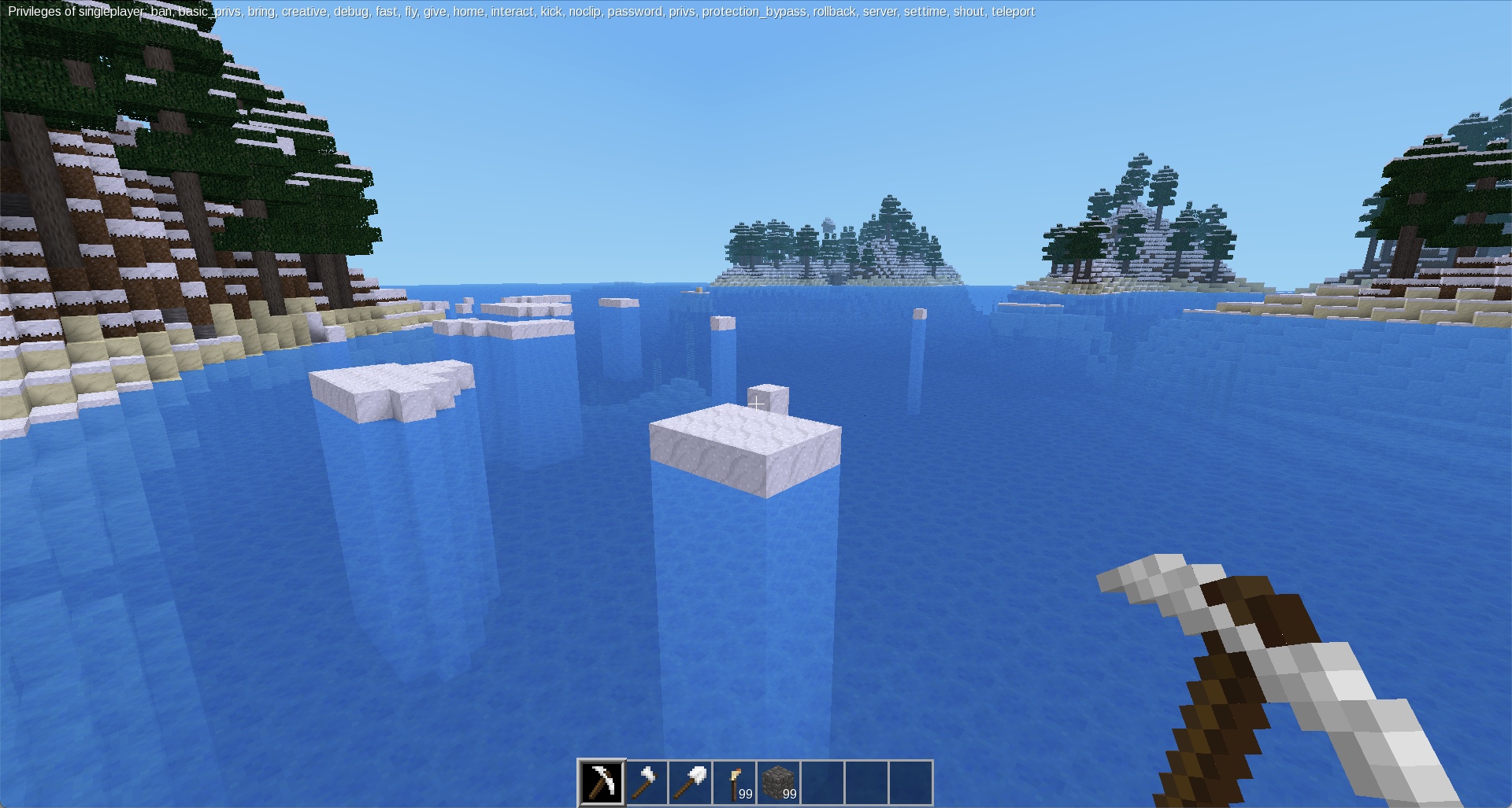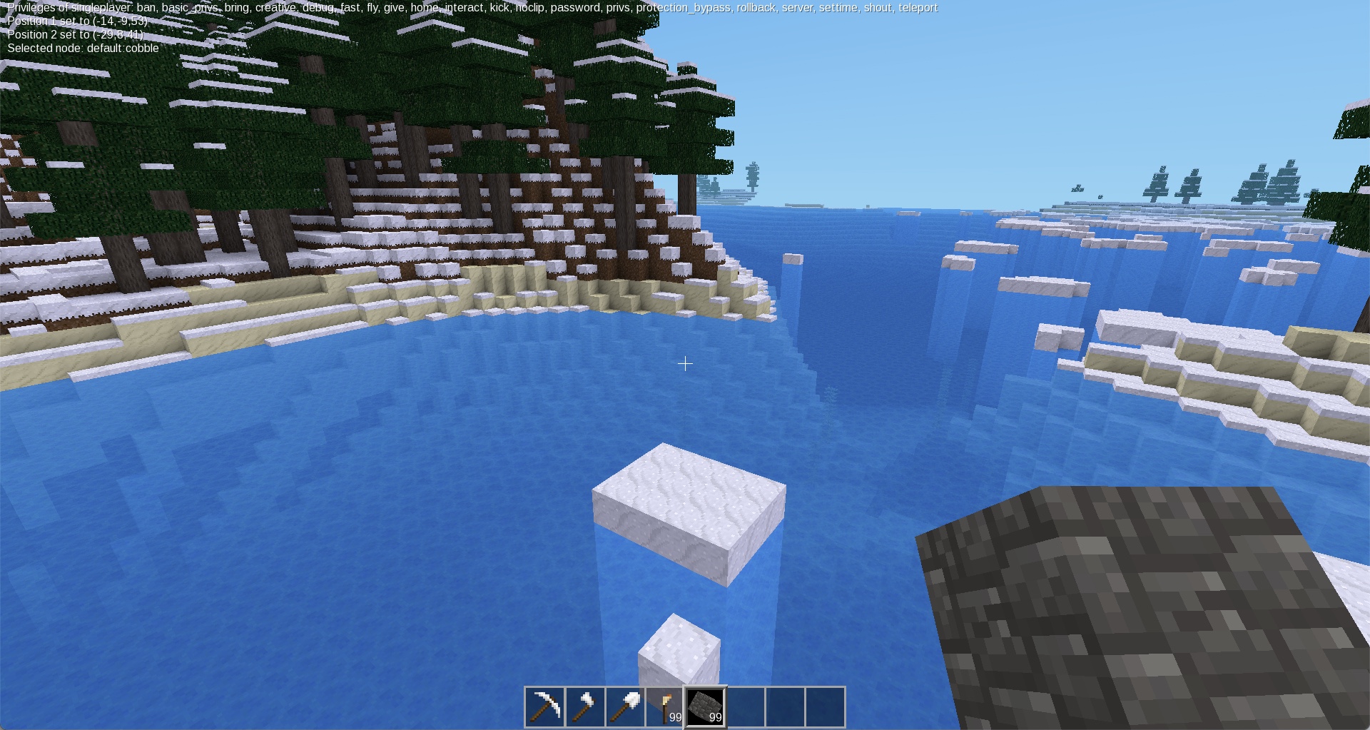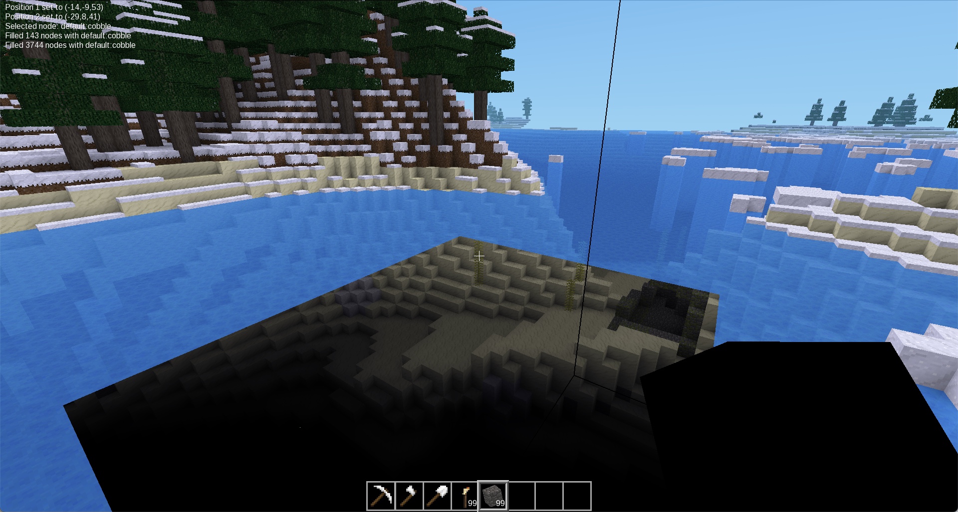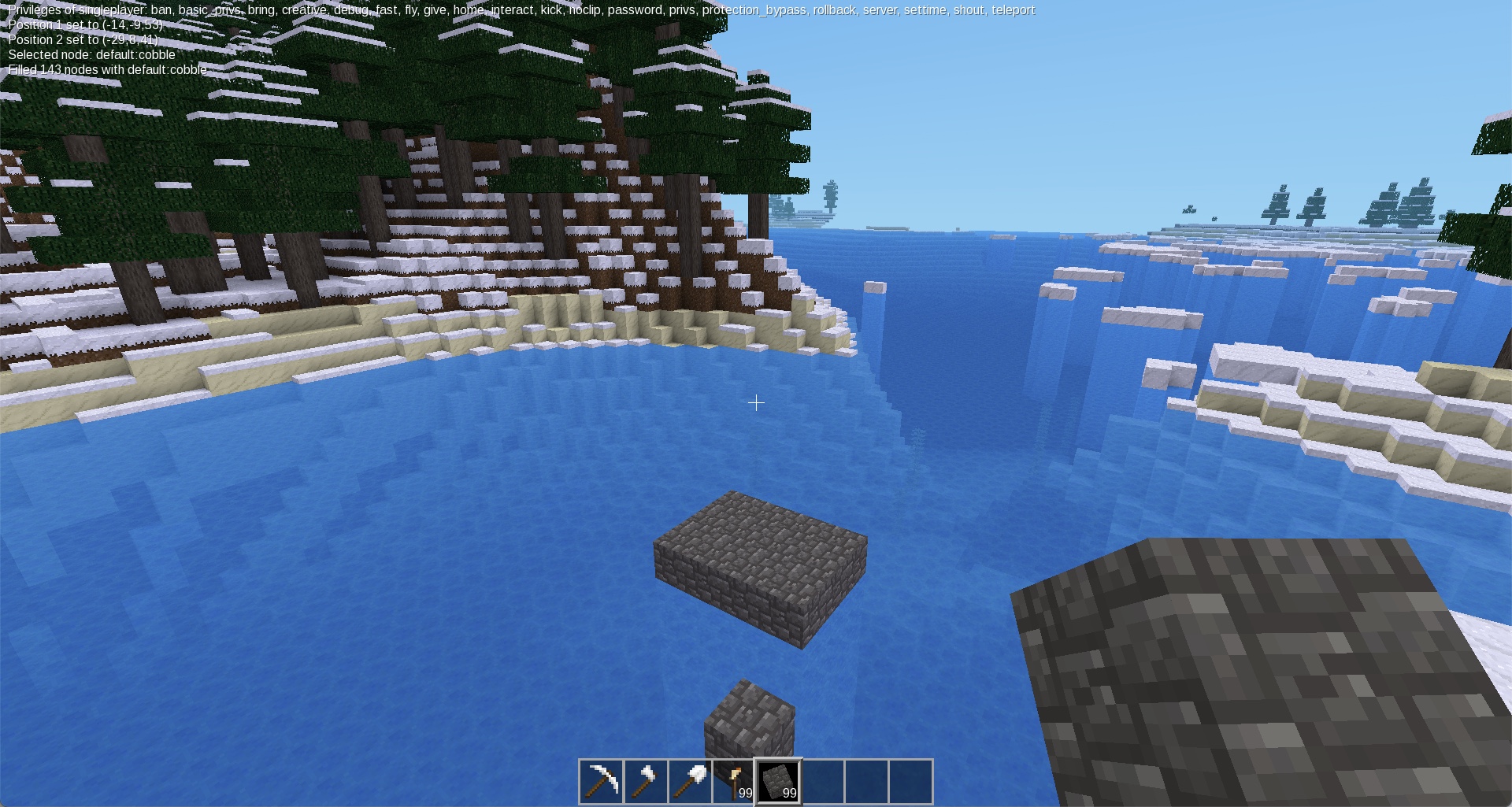 /fill: Basically a replace command; it finds all except air and water blocks in the area selected and sets them to the /setnode node, whatever that might be (note, this will cause the server to crash if it's not an item you can place normally.)